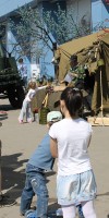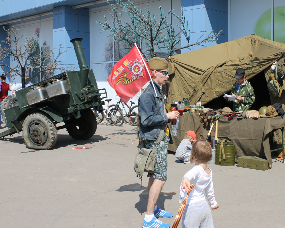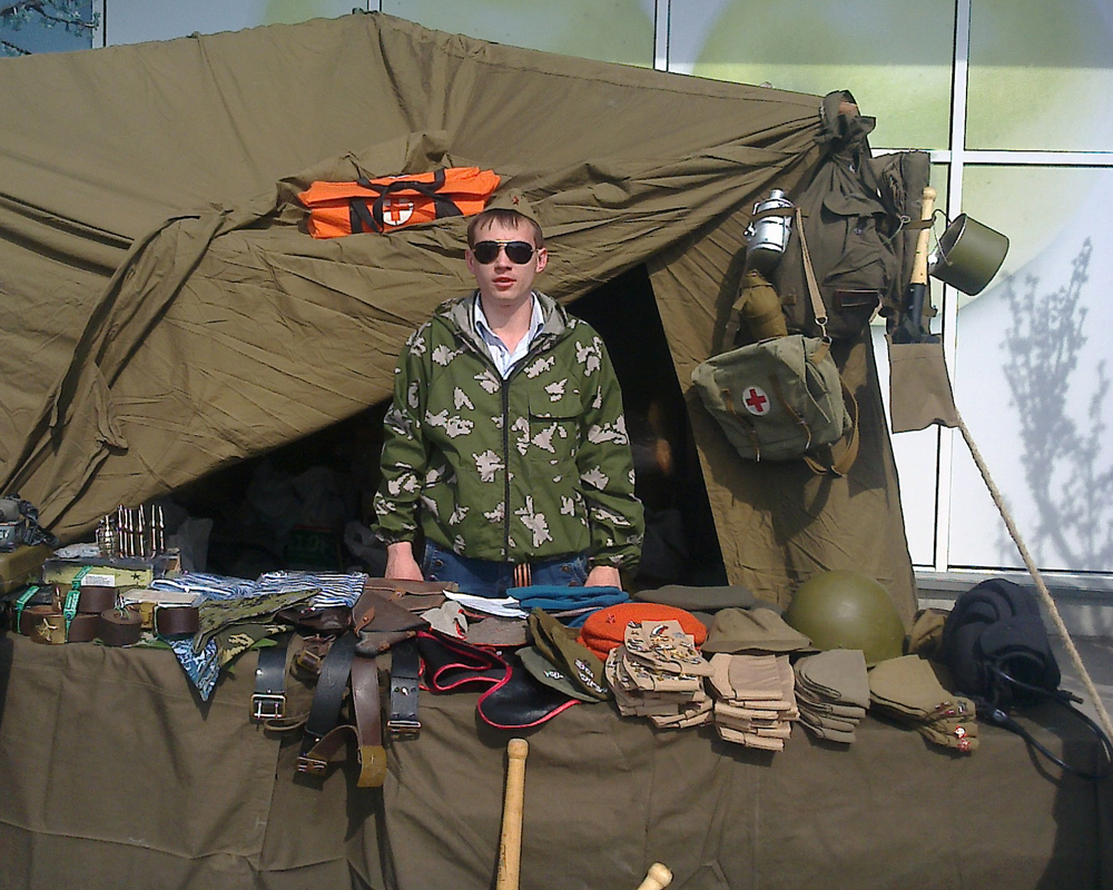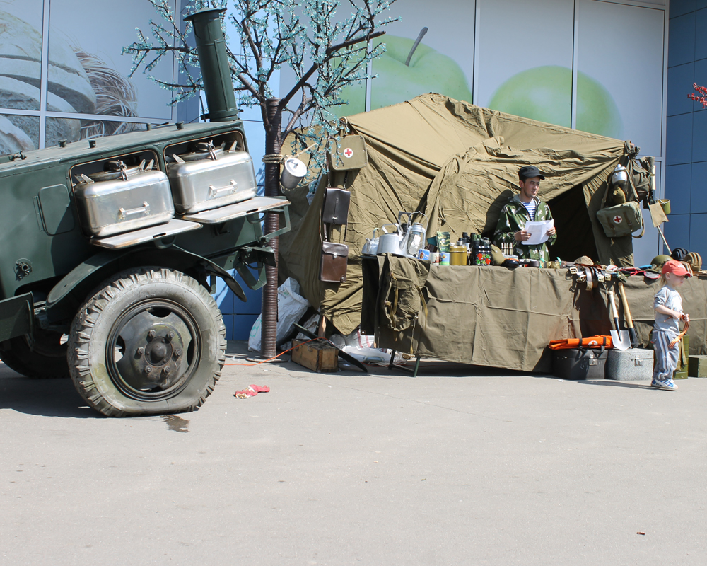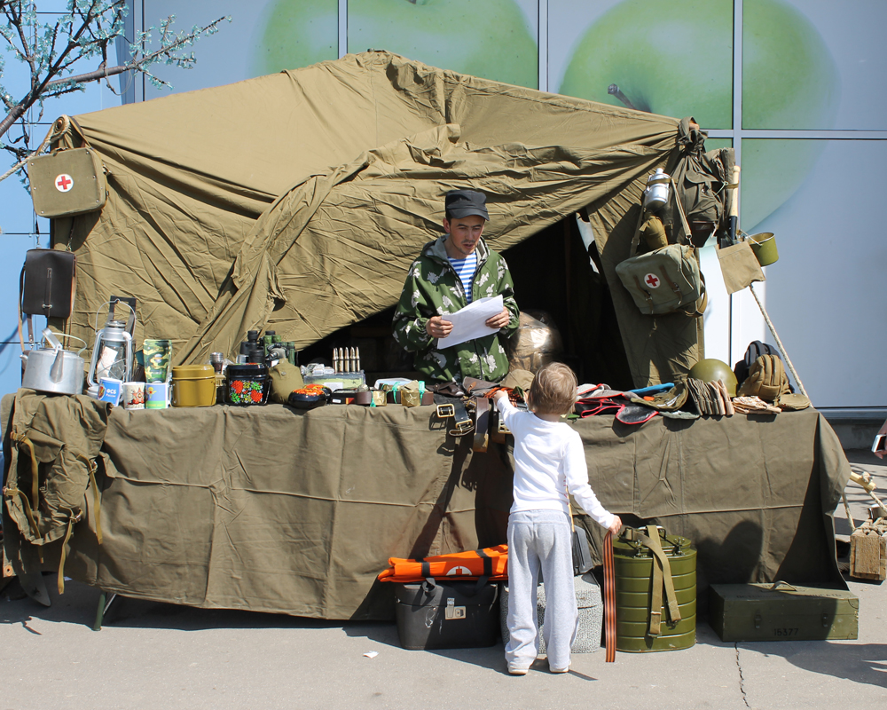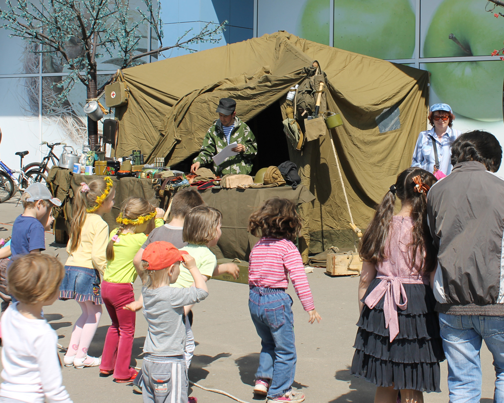 В своей армейской палатке ребята представили множество атрибутов военного быта. Самыми благодарными зрителями стали дети и подростки, которым было очень интересно всё это рассмотреть и подержать в руках. Компания «Гарнизон» представила здесь элементы военной формы (пилотки, каски, танкистские шлемы), а также солдатские и офицерские ремни, армейскую посуду (котелки, фляги, армейские термоса), вещмешки, полевые сумки, медицинские чемоданчики, сапёрные лопатки, военную и советскую атрибутику. Для детей здесь же провели развлекательную программу с играми и конкурсами.