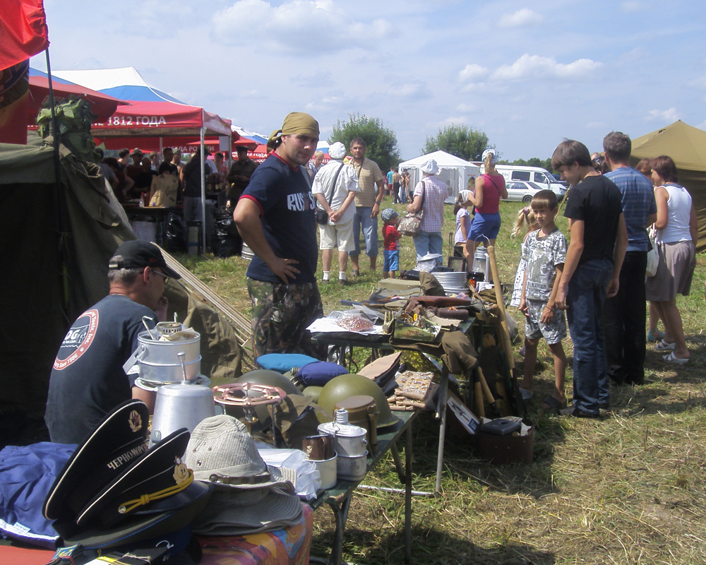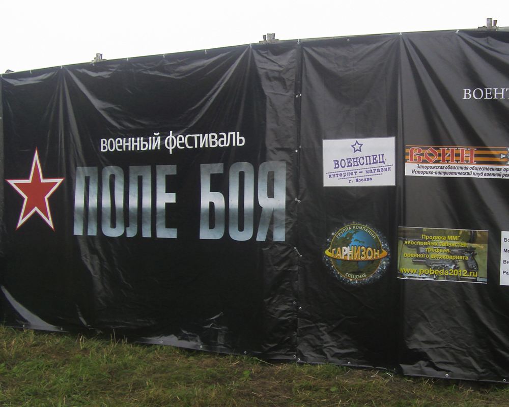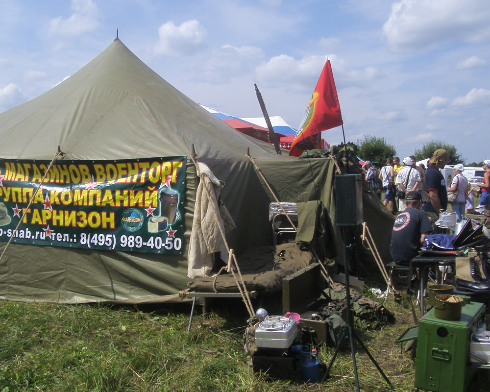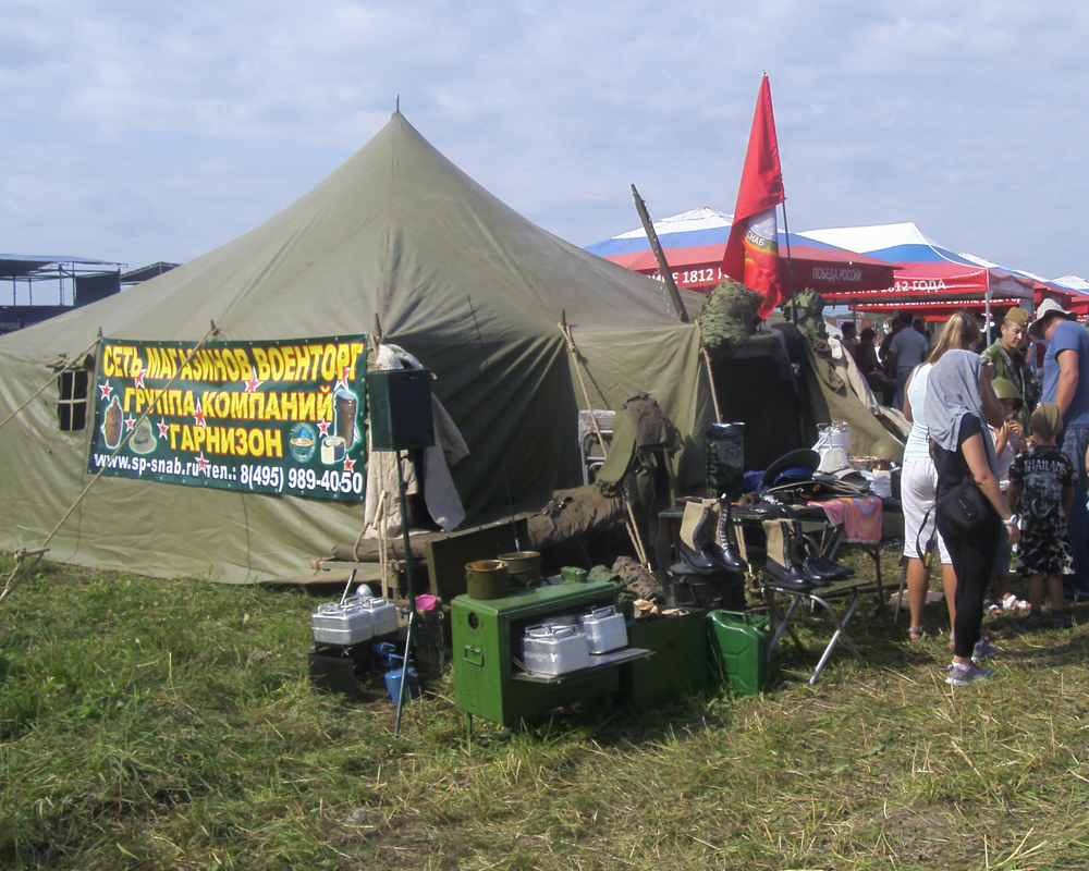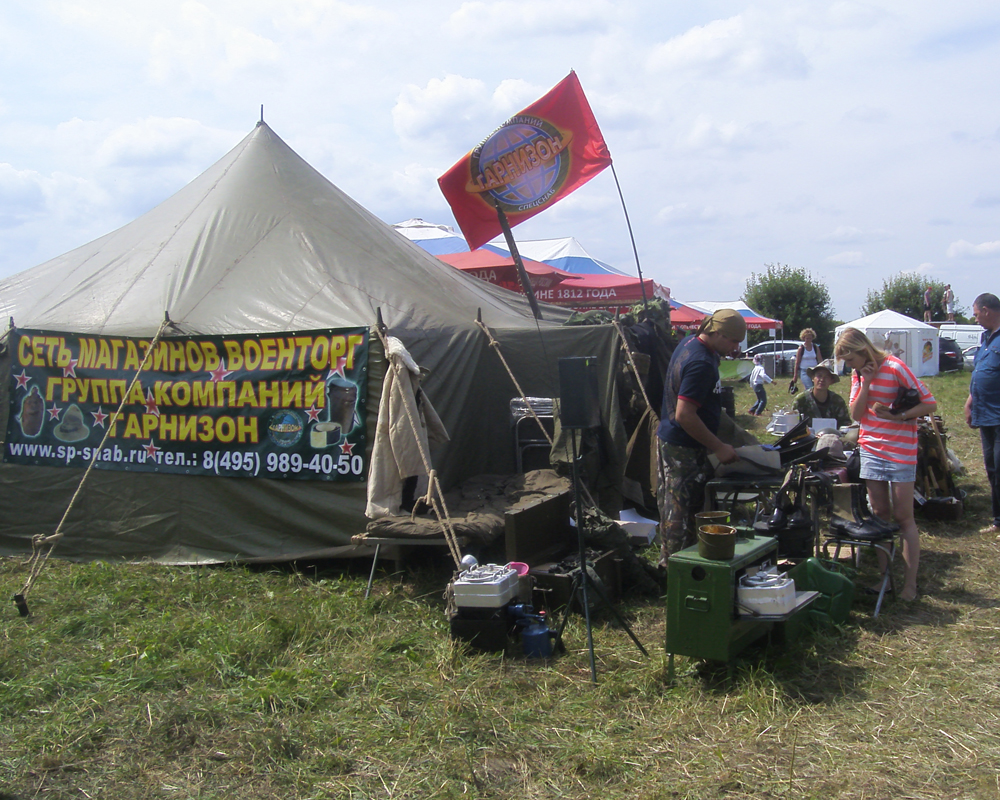 Приняла участие в «Поле боя-2013» и компания «Гарнизон». Мы представили здесь не только образцы формы, военные палатки, обмундирование, плащ-палатки, вещмешки, каски, фуражки, армейскую обувь, но и значки и военную символику времён СССР.